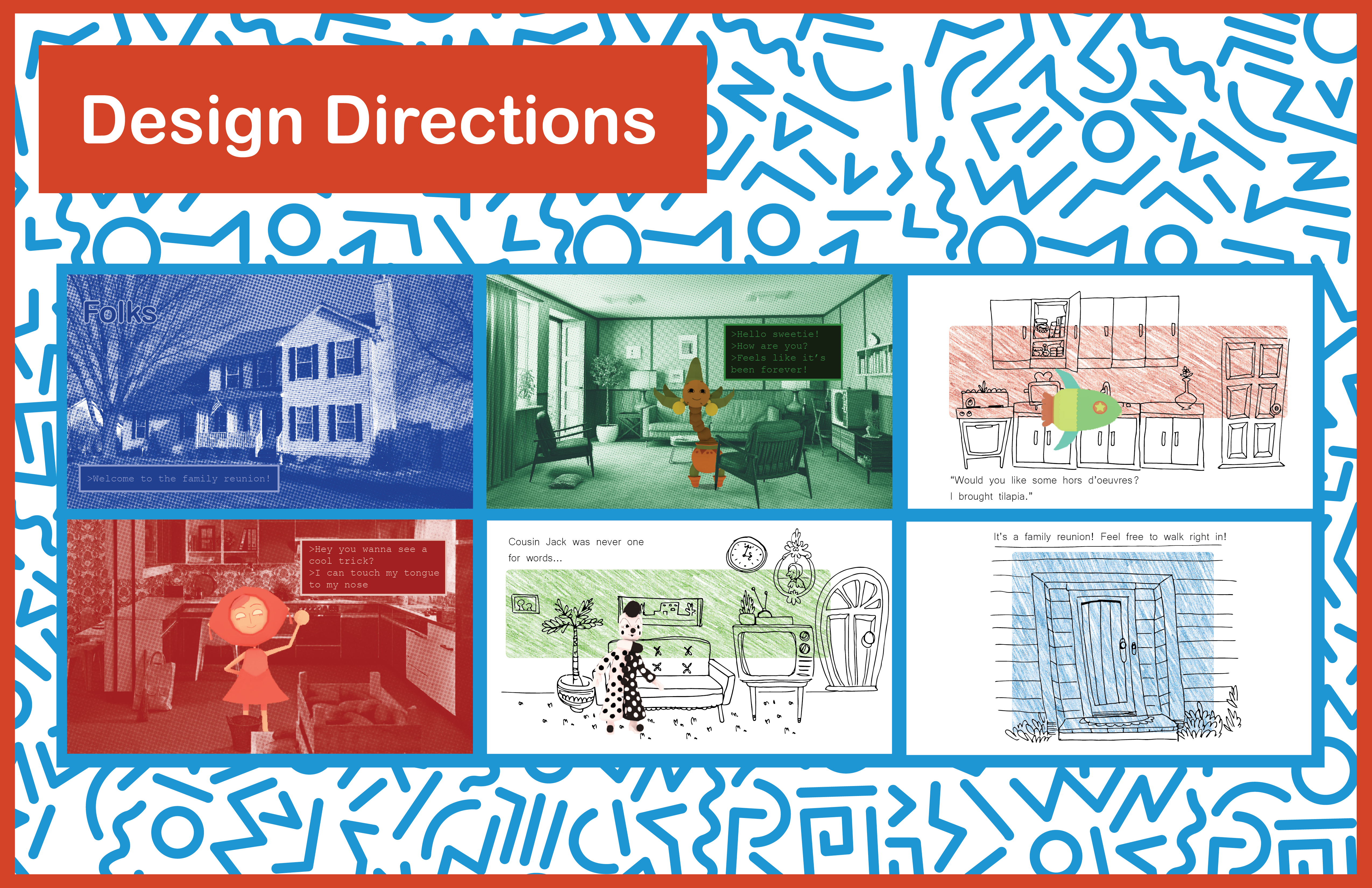 Folks is a website that went through various stages, beginning with a simple 3D modeled projection on a dollhouse. The website is designed as a walk about a small family reunion.